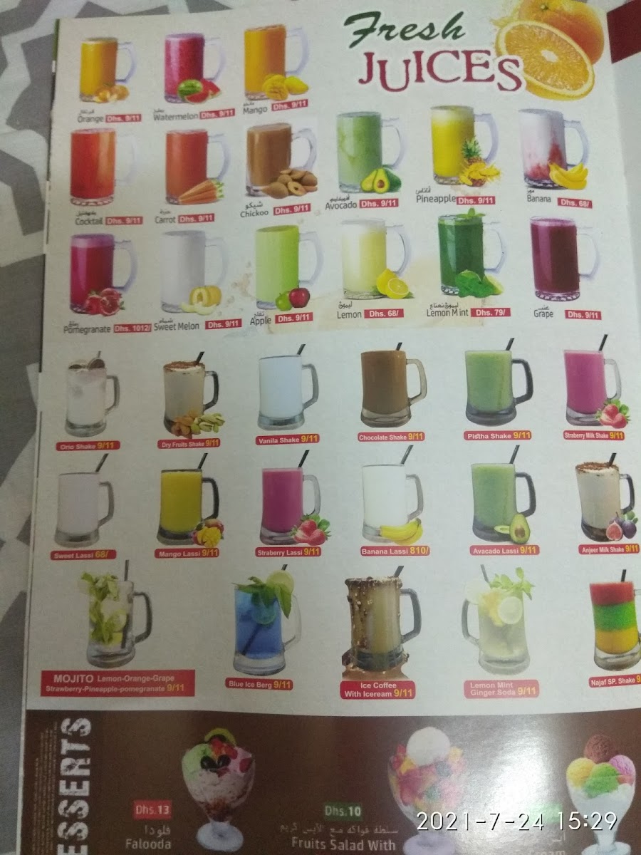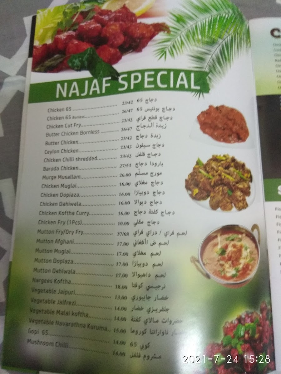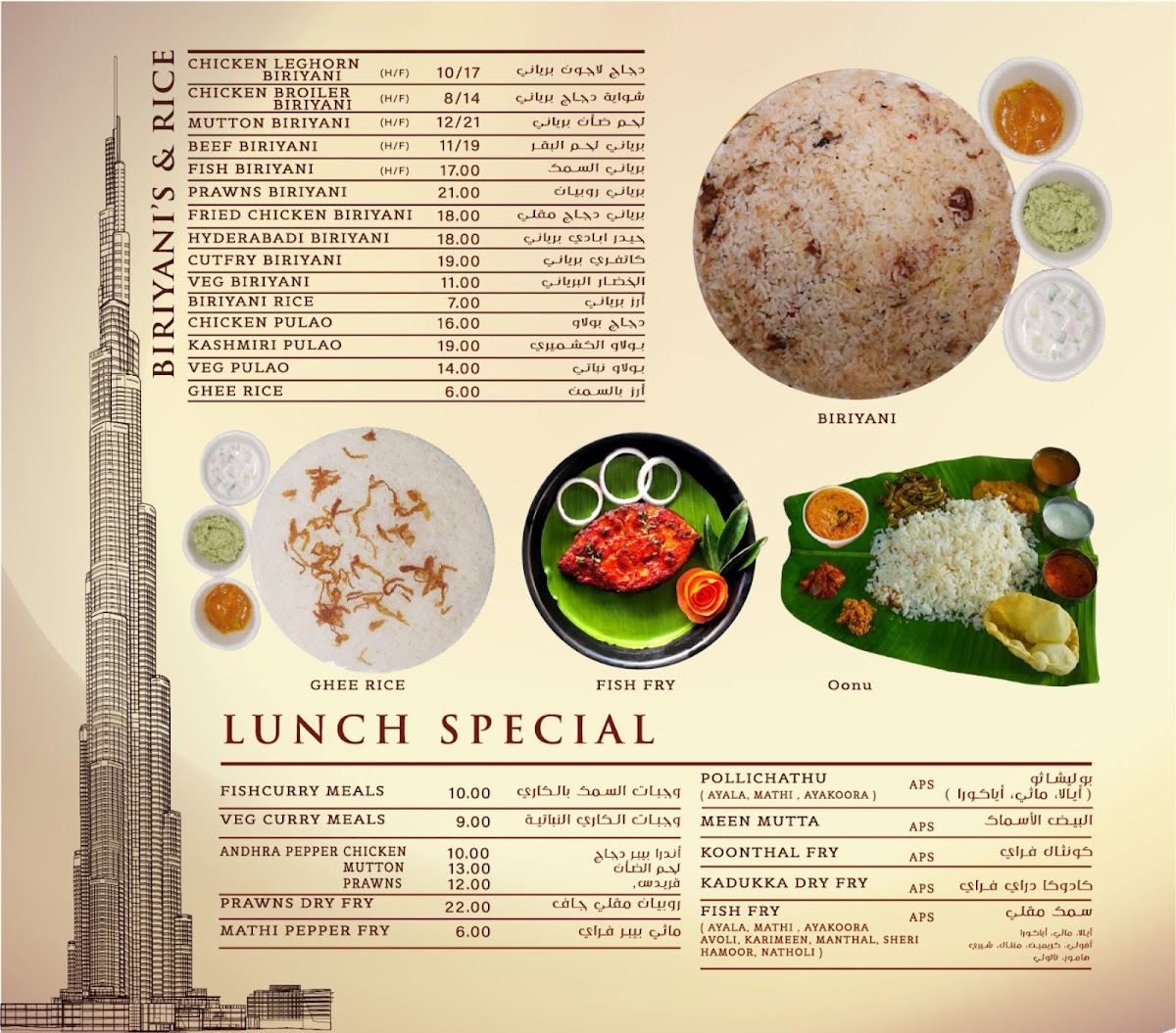 In addition to traditional biryani and starters, the menu highlights Indo-Chinese dishes such as Chilly Chicken, which consists of crispy chicken pieces tossed in a spicy and tangy sauce with vegetables. There are also notable dishes like Porotta accompanied by Chicken 65, commonly ordered together.